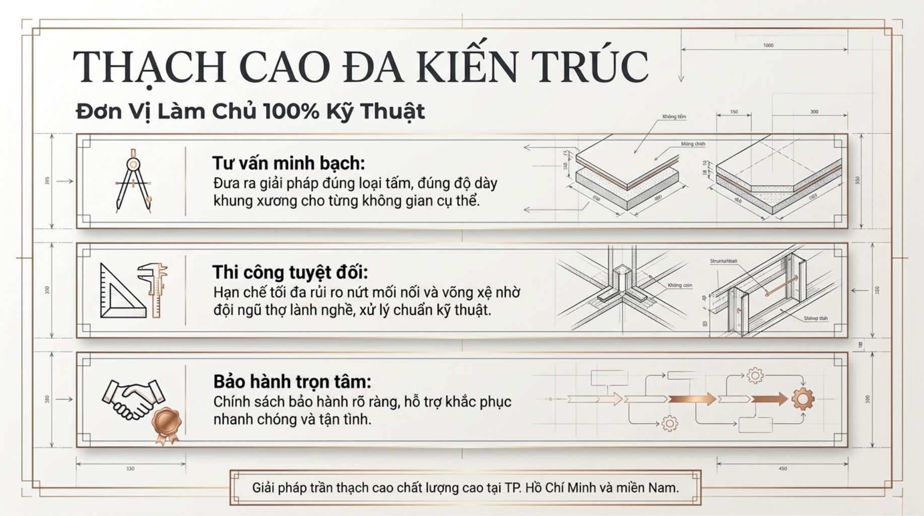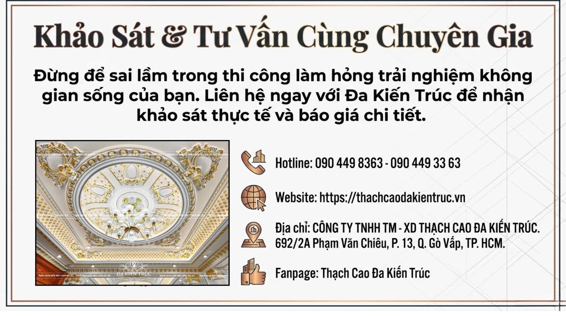 Thạch Cao Đa Kiến Trúc cam kết mang đến giải pháp thi công trần thạch cao chuẩn kỹ thuật – bền đẹp theo thời gian – tối ưu chi phí cho mọi công trình tại TP.HCM. Liên hệ ngay để được tư vấn và khảo sát thực tế miễn phí!